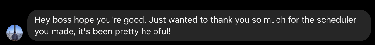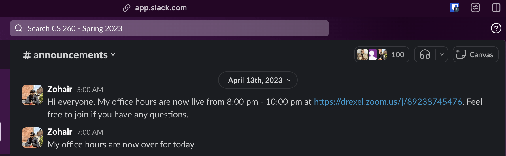 "Hi everyone. My office hours are now live from {} - {} at {}. Feel free to join if you have any questions.".format(